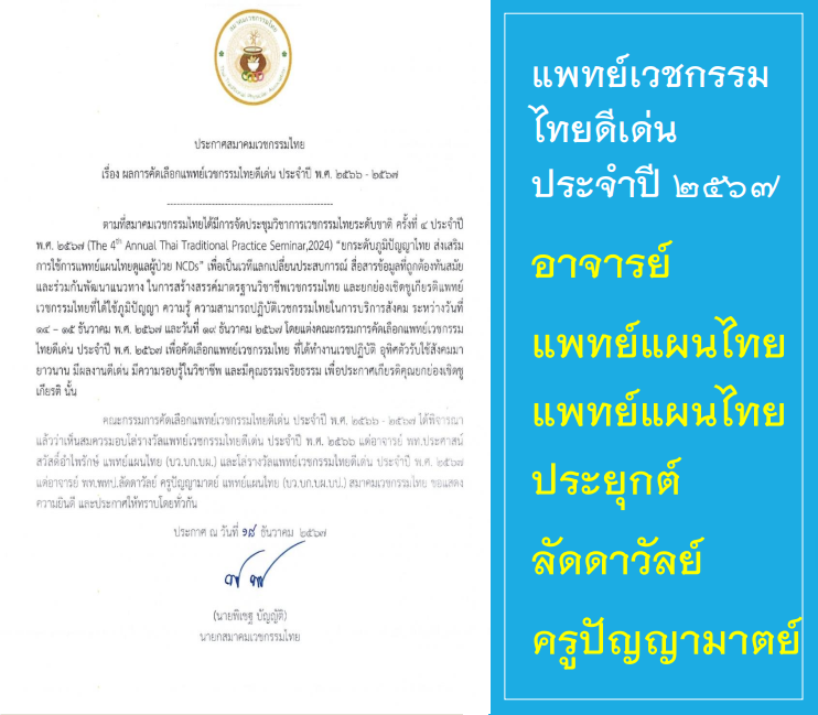 อาจรย์แพทย์แผนไทย ลัดดาวัลย์ ครูปัญญามาตย์แพทย์เวชกรรมไทยดีเด่น ประจำปี 2567