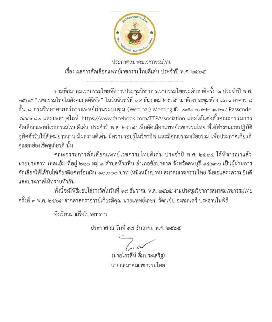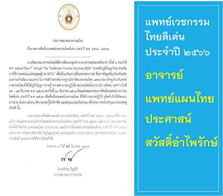 อาจรย์แพทย์แผนไทย ประศาสน์ สวัสดิ์อำไพรักษ์แพทย์เวชกรรมไทยดีเด่น ประจำปี 2566